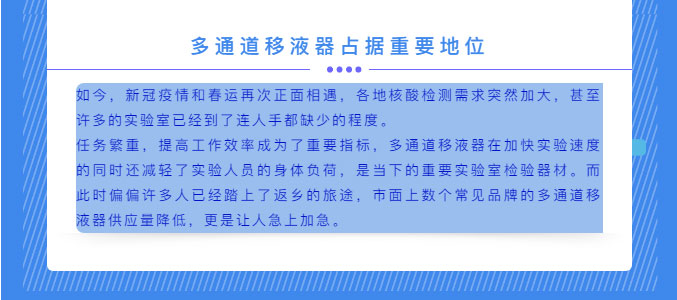 任務(wù)繁重,提高工作效率成為了重要指標,多通道移液器在加快實(shí)驗速度的同時(shí)還減輕了實(shí)驗人員的身體負荷,是當下的重要實(shí)驗室檢驗器材。而此時(shí)偏偏許多人已經(jīng)踏上了返鄉的旅途,市面上數個(gè)常見(jiàn)品牌的多通道移液器供應量降低,更是讓人急上加急。