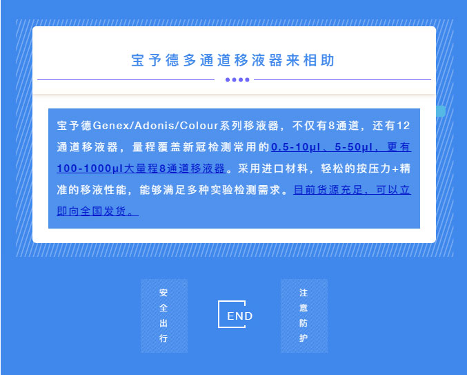 寶予德Genex/Adonis/Colour系列移液器,不僅有8通道,還有12通道移液器,量程覆蓋新冠檢測常用的0.5-10μl、5-50μl,更有100-1000μl大量程8通道移液器。采用進(jìn)口材料,輕松的按壓力+精準的移液性能,能夠滿(mǎn)足多種實(shí)驗檢測需求。目前貨源充足,可以立即向全國發(fā)貨。