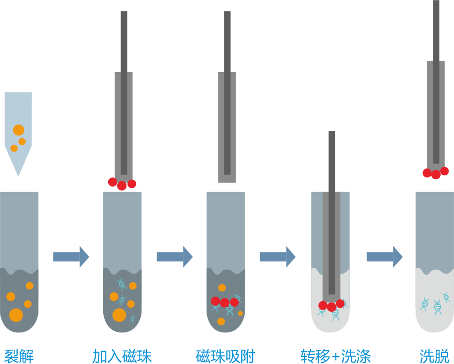 裂解:通常裂解液中會(huì )含有洗滌劑,根據樣本的不同還會(huì )添加蛋白酶,用于裂解和溶解蛋白質(zhì);另外還有高濃度的離液鹽,如異硫氰酸胍,它能擾亂氫鍵,破壞核酸與水之間的結合,使核酸能夠與磁珠結合。