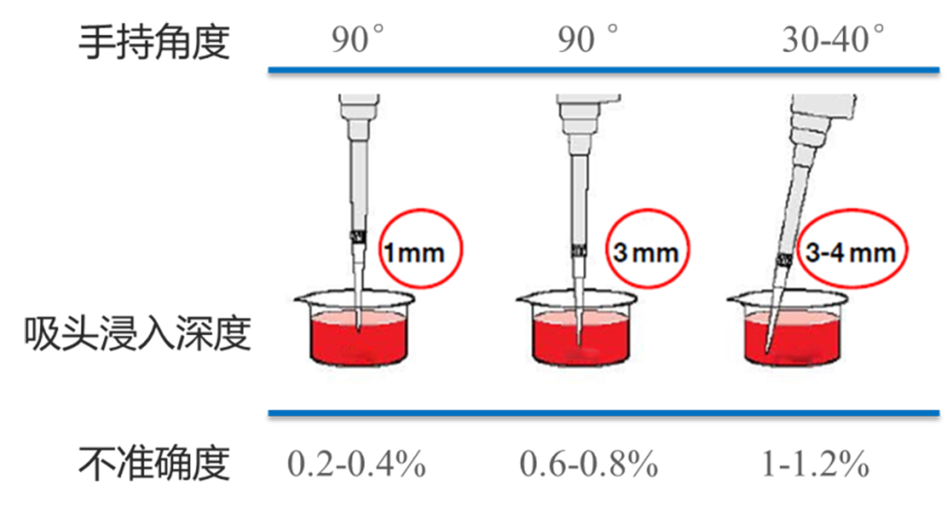 在吸液過(guò)程中,如果吸頭浸沒(méi)過(guò)多,額外增大的壓力會(huì )使多余的液體被移液器吸入,并且過(guò)分浸入會(huì )導致外壁殘留液體增多從而造成移液量值偏高;如果吸頭浸沒(méi)高度不足,空氣將會(huì )隨液體吸入吸頭內,從而產(chǎn)生氣泡造成量值偏低;