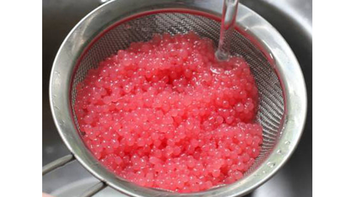 將成型的西瓜魚(yú)子醬顆粒倒出來(lái),用純凈水沖洗掉表面多余的氯化鈣溶液;