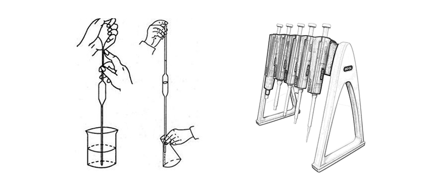 在遙遠的一百多年前,實(shí)驗室里的精英們開(kāi)始用移液管來(lái)轉移液體。所謂移液管,就是一根空心的玻璃管,上面標著(zhù)1到N個(gè)刻度。把這根玻璃管插到液體里面,在管子的另一頭用嘴(剛開(kāi)始,我們的精英們只能用他們寶貴的嘴巴來(lái)干這個(gè)活)或洗耳球把液體吸到管子里,而上面的刻度則告訴我們里面有多少液體了。在吸滿(mǎn)我們需要的量之后,用拇指把吸液的這一頭堵上,然后把管子放到另外一個(gè)容器里,把手一松,讓管子里的液體流入到第二個(gè)容器中。這樣我們轉移液體的任務(wù)就搞定了!