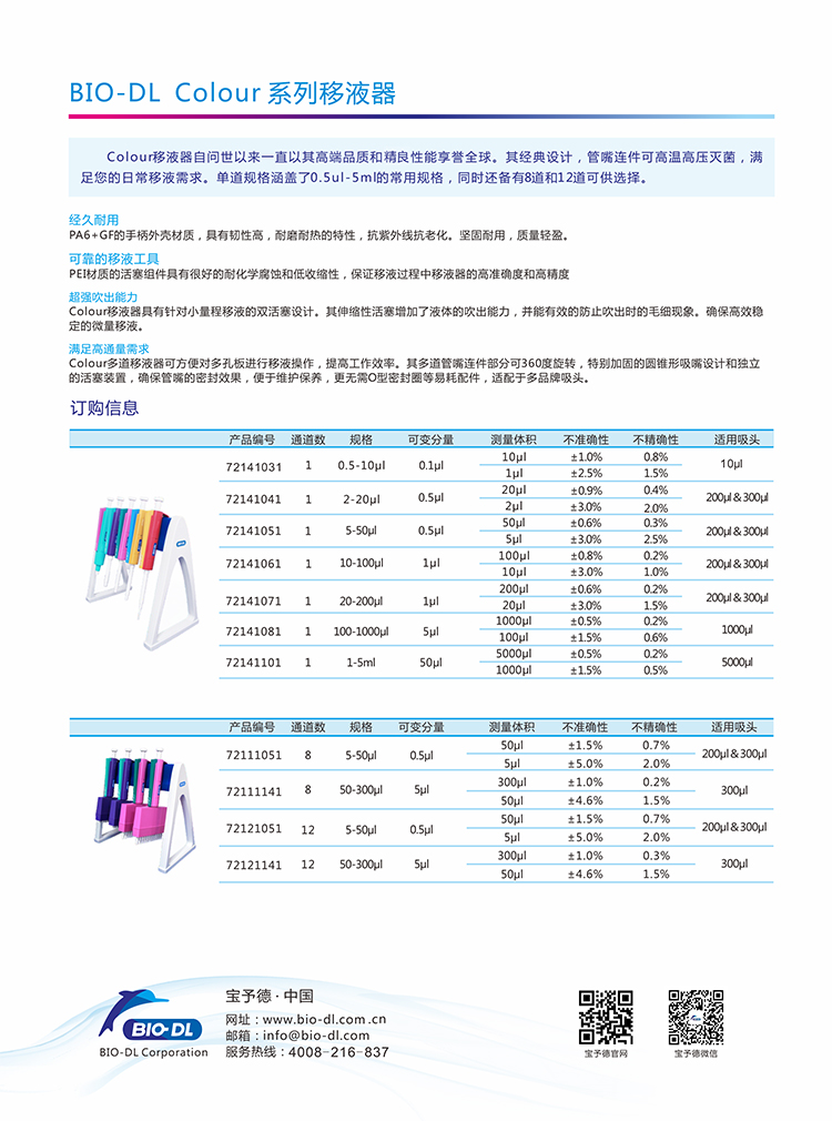 Colour彩色移液器是更具性?xún)r(jià)比的經(jīng)久耐用的移液器,其下涵蓋單道微量可調移液器0.5-1000μl,單道可調大體積移液器1-5ml和多道微量可調移液器5-300μl。